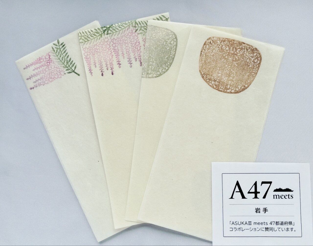 絵柄は、極楽浄土の世界を演出したといわれている中尊寺華鬘を模したものと、一関市東山町の猊鼻渓に咲く藤の花をイメージしたものを銅版画家の岩渕俊彦さんに彫っていただきました。大切な方へ気持ちを伝えたい時には、手間をかけて作られた和紙に思いをしたためてみませんか。